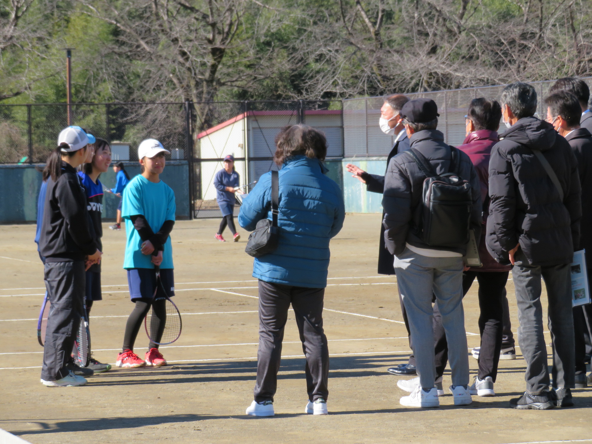 坂戸市体育協会長を始め、各競技団体の代表者、教育委員会事務局の担当者が、KONOIKEグリーンフィールドで行われていたソフトテニス(女子)の活動を参観し、参加部員や指導者との情報交換を行いました。また、当日は、あその学園義務教育学校で通常の学校部活動と地域部活動を同時に展開している様子も見てもらい、積極的に指導者や生徒に声かけをし、有益な研修を進めてもらいました。